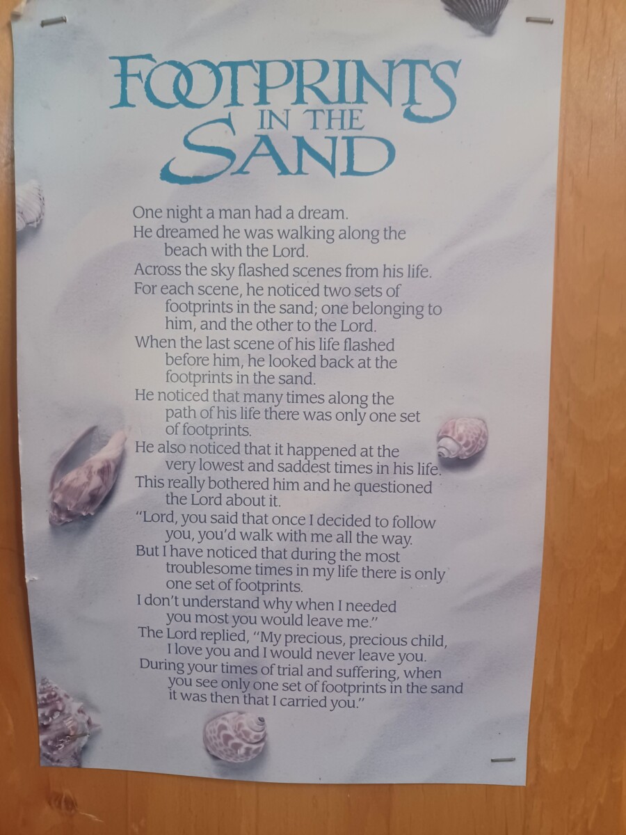 We went to visit this less-engaged member in our ward who has muscular dystrophy and can barely move anymore. But she was the most positive and happy person I have met. She is grateful for the little things she can still do. It is cool to see someone who is going through such a hard time but still has put so much trust in the Lord. She had this awesome poem hung up in her house and I think it really shows how much Jesus Christ supports us. Hope you take second to read through it!